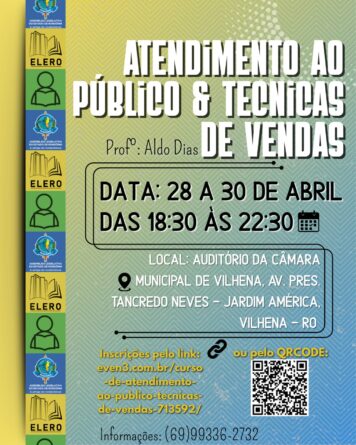 A população de Vilhena terá uma nova oportunidade de qualificação profissional gratuita por meio da Escola do Legislativo de Rondônia. O curso “Atendimento ao Público & Técnicas de Vendas” será realizado entre os dias 28 e 30 de abril, na Câmara Municipal de Vilhena, no período noturno, das 18h30 às 22h30.