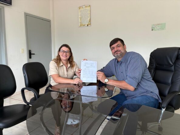 Assessora Kashna Selhorst entregando em mãos o comprovante bancário ao prefeito Silvano Almeida de Cabixi.